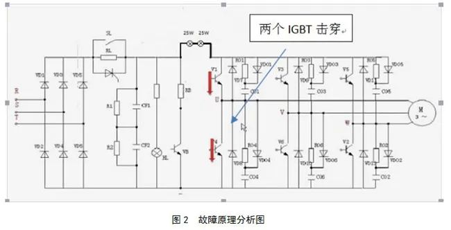 圖2為故障基本原理分析圖表,假定U相的2個(gè)IGBT都穿透了,等同于U相短路故障,這時(shí)一上燈泡即亮。